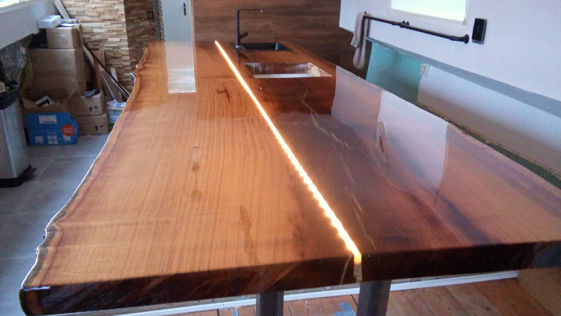 Holzarbeitsplatte mit integrierter LED-Beleuchtung, beschichtet mit Epoxidharz und Guss-/Fotoepoxidharz.