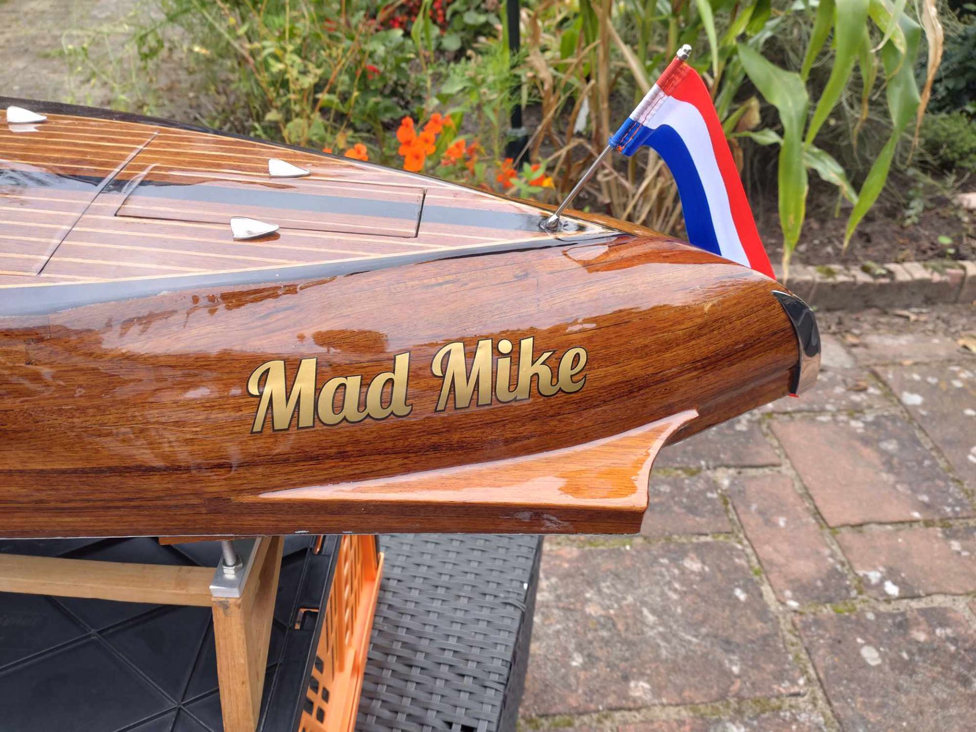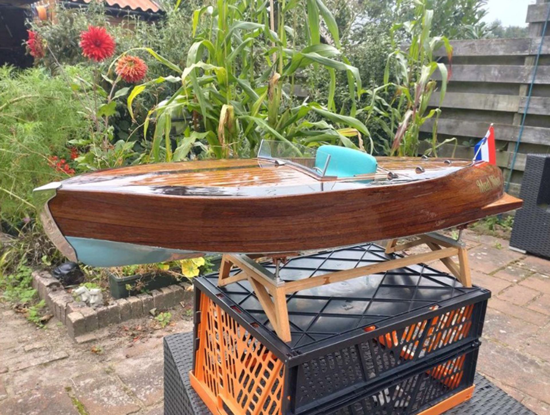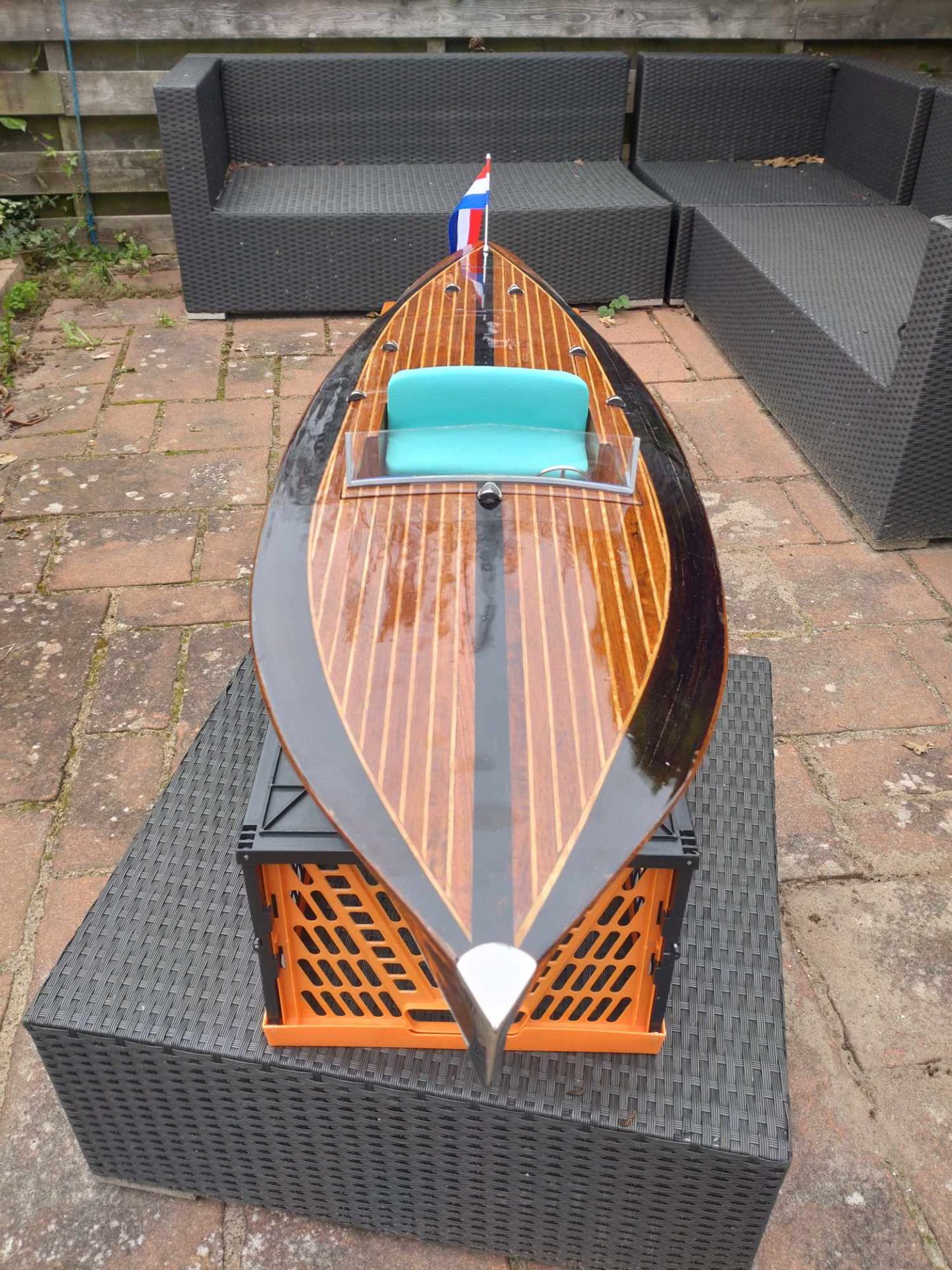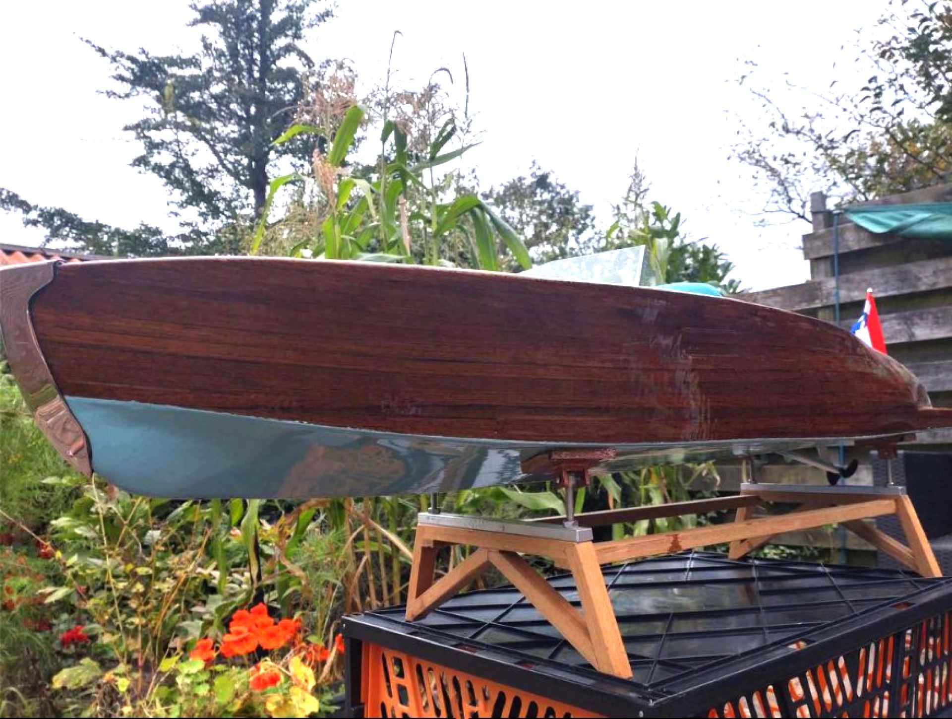 Der Rahmen ist aus Sperrholz und das Äußere aus Teakholz gefertigt. Das Deck ist aus Teak, Eiche und dunklem Wengeholz gefertigt. Dann wird es mit 50g Gewebe und Universal-Epoxid beschichtet. Und dann noch 7 Mal mit demselben Harz lackiert. Für das Unterwasserschiff wurde Epoxidpigment ral in 6034 in Kombination mit Universalepoxid verwendet.